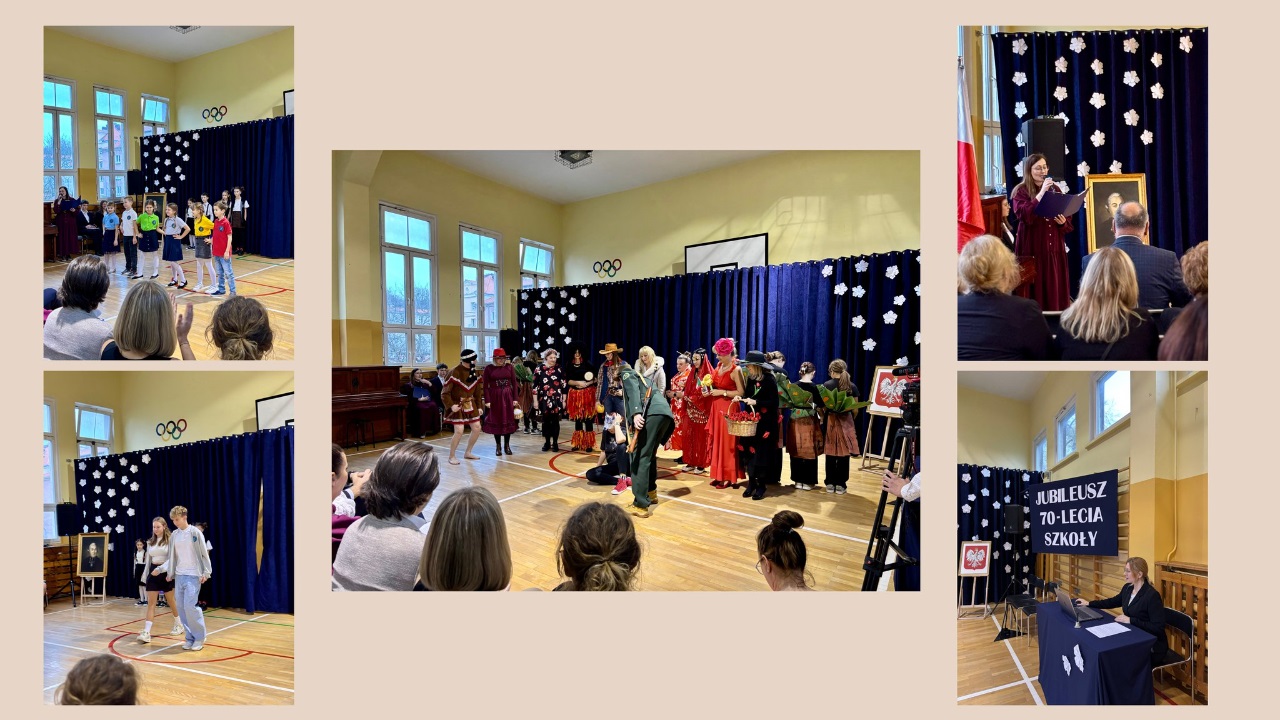 . Uroczystość obchodów 70-lecia rozpoczęli uczniowie, którzy zabrali nas w zabawną podróż przez historię szkolnych mundurków