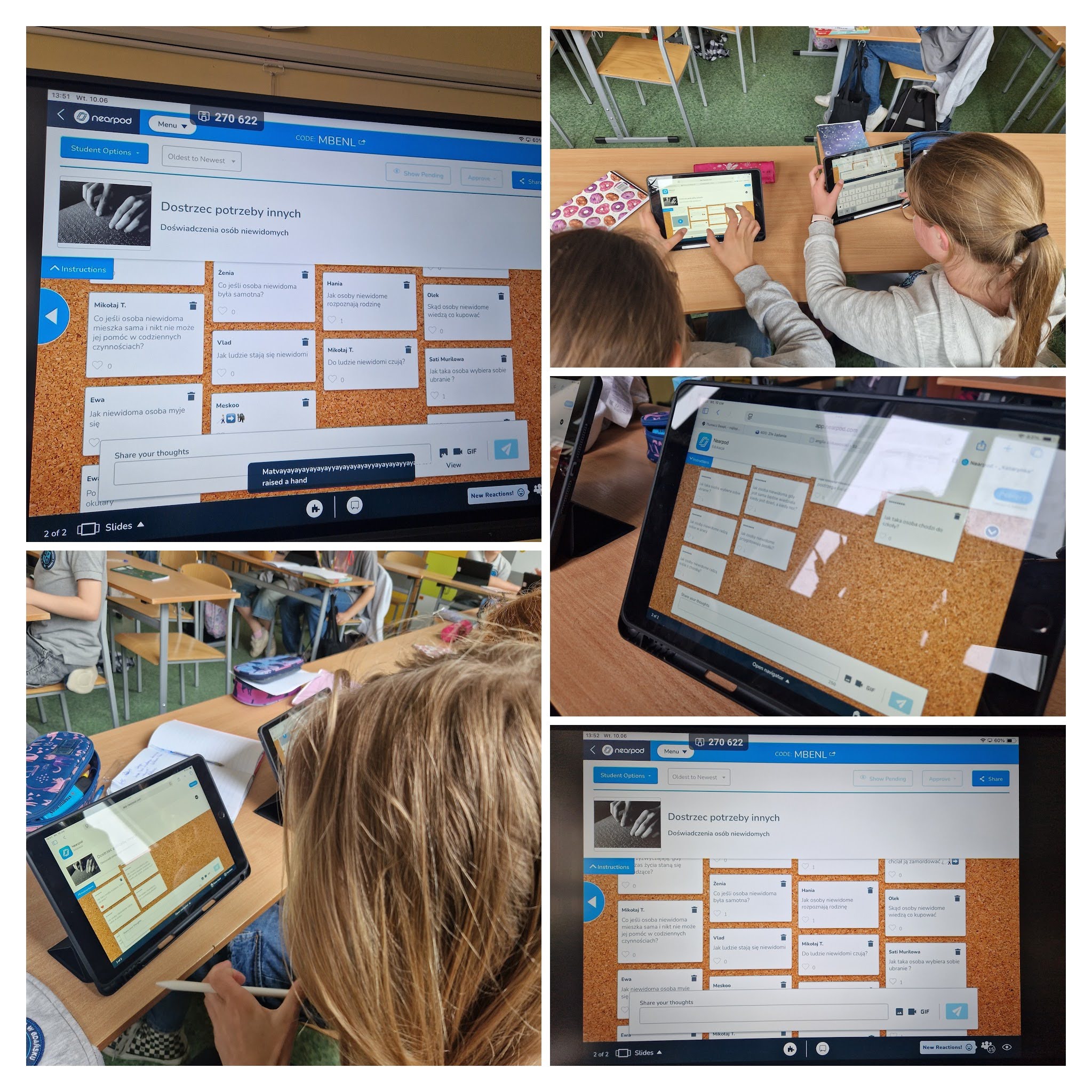Uczniowie doświadczali świata z zasłoniętymi oczami, by wczuć się w osoby niewidome. Po doświadczeniu ich zadaniem było sformułowanie 12 pytań otwartych (rutyna myślenia krytycznego), które nasuwają się im w związku z doświadczeniem. Uczniowie przesyłali je współpracując w aplikacji Nearpod. Po wykonaniu zadania pytania zostały udostępnione na tablicy mulimedialnej. Wszyscy uczniowie mogli je zobaczyć i odnieść się do nich w dyskusji.