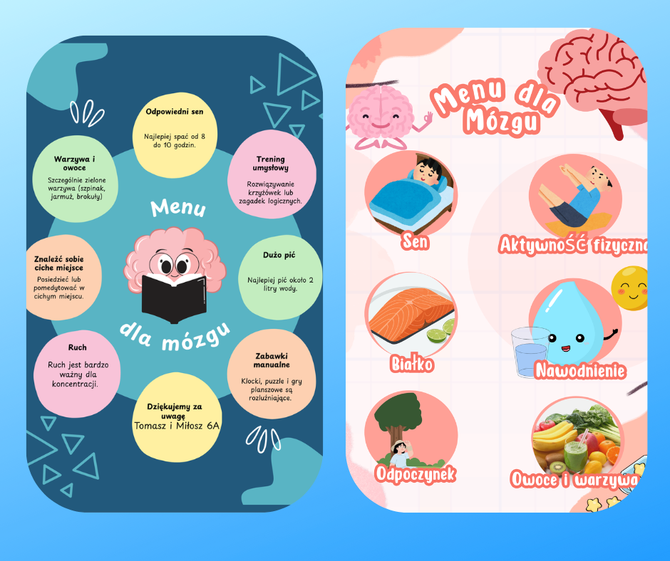 Uczniowie klasy VIA, na podsumowanie zajęć o zdrowiu fizycznym na zajęciach edukacji zdrowotnej, przygotowali infografiki pt. Menu dla mózgu w programach Canva lub Freefom.